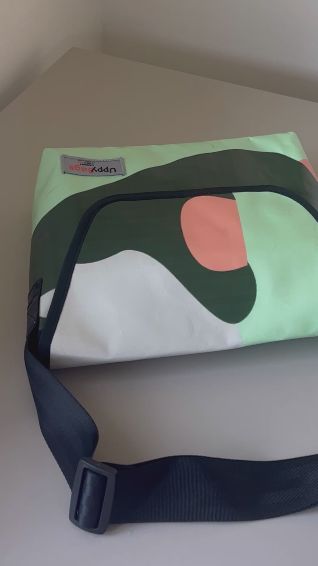 Durable and versatile messenger/shoulder bag. Made from 80% upcycled materials (outer -banners, inner - banner support, shoulder strap - from upcycled plastic bottles).